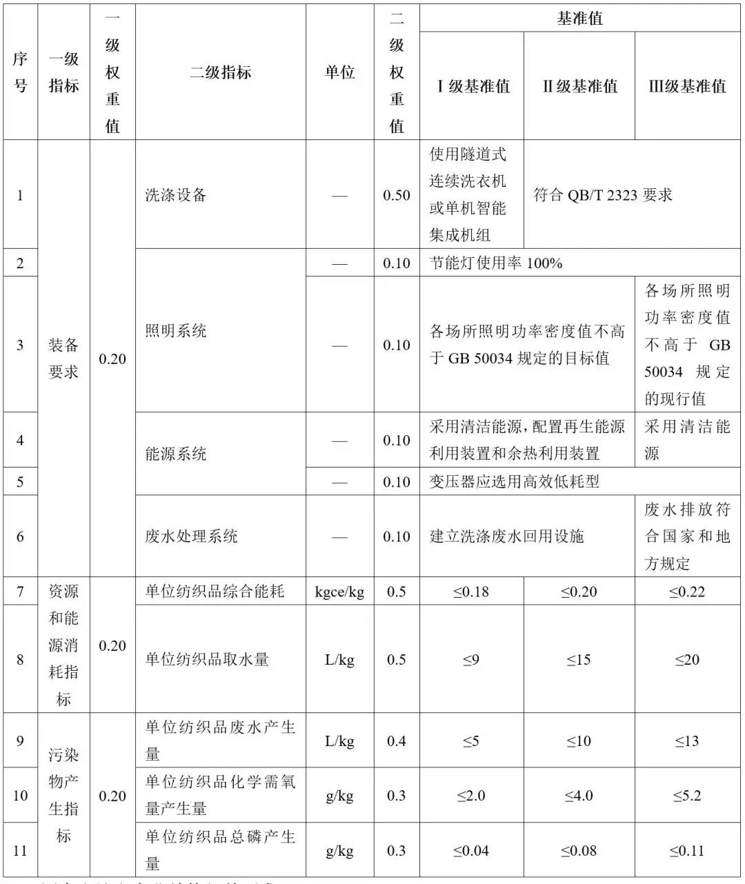 國(guó)家發(fā)改委、生態(tài)環(huán)境部、商務(wù)部于2018年12月29日頒布實(shí)施了《洗染業(yè)清潔生產(chǎn)評(píng)價(jià)指標(biāo)體系》(國(guó)家發(fā)改委 生態(tài)環(huán)境部 商務(wù)部 公告 2018年 第85號(hào))。《指標(biāo)體系》適用于洗染企業(yè)的清潔生產(chǎn)審核、清潔生產(chǎn)潛力與機(jī)會(huì)的判斷以及清潔生產(chǎn)績(jī)效評(píng)定和清潔生產(chǎn)績(jī)效公告制度,也適用于環(huán)境影響評(píng)價(jià)、排污許可證管理、環(huán)保領(lǐng)跑者等環(huán)境管理制度。以公用紡織品為例,《指標(biāo)體系》部分內(nèi)容如下表所示。